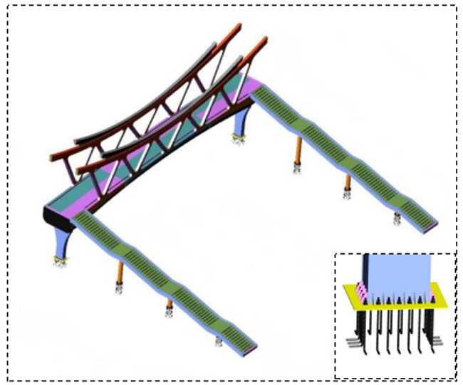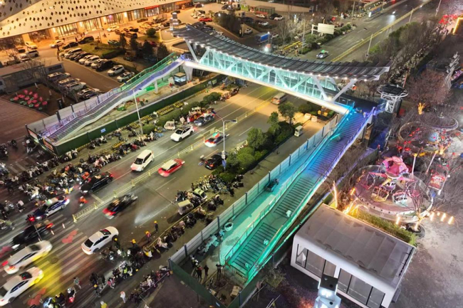 印象濟(jì)南·泉世界作為濟(jì)南西部重要的文旅商業(yè)綜合體,長期面臨人車交織的通行壓力與安全隱患。本次建設(shè)的天橋全長47.3米,橋面寬5米,以“雄鷹展翅”為造型,將橋體結(jié)構(gòu)、材質(zhì)、色彩進(jìn)行巧妙融合,實(shí)現(xiàn)人車分流、保障通行安全,成為串聯(lián)不同風(fēng)貌街區(qū)的景觀紐帶。該項(xiàng)目直面商圈出行痛點(diǎn),選址于人流密集區(qū)域,南北雙側(cè)配備梯道與垂直電梯,全面貫徹全齡友好、無障礙通行理念,全力打造一座讓市民安心、讓城市暖心的“連心橋”。